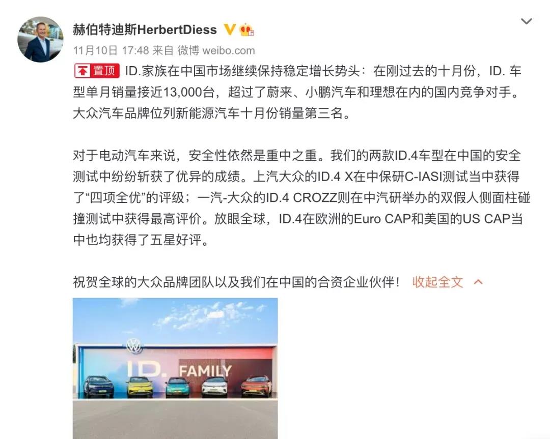 據了解,大眾旗下的德國工廠有茨維考工廠和德累斯頓工廠。而茨維考工廠主要負責生產大眾ID.3、ID.4、奧迪Q4 e-tron和Cupra Born等車型。值得注意的是,早幾日,大眾汽車集團迪斯在社交平臺發文表示,ID.家族在中國市場繼續保持穩定增長勢頭,十月ID.車型單月銷量為12376臺,超過蔚來、小鵬汽車和理想等國內競爭對手。不能看出此次停產,也將導致這些車輛供應在短時間內受到限制。