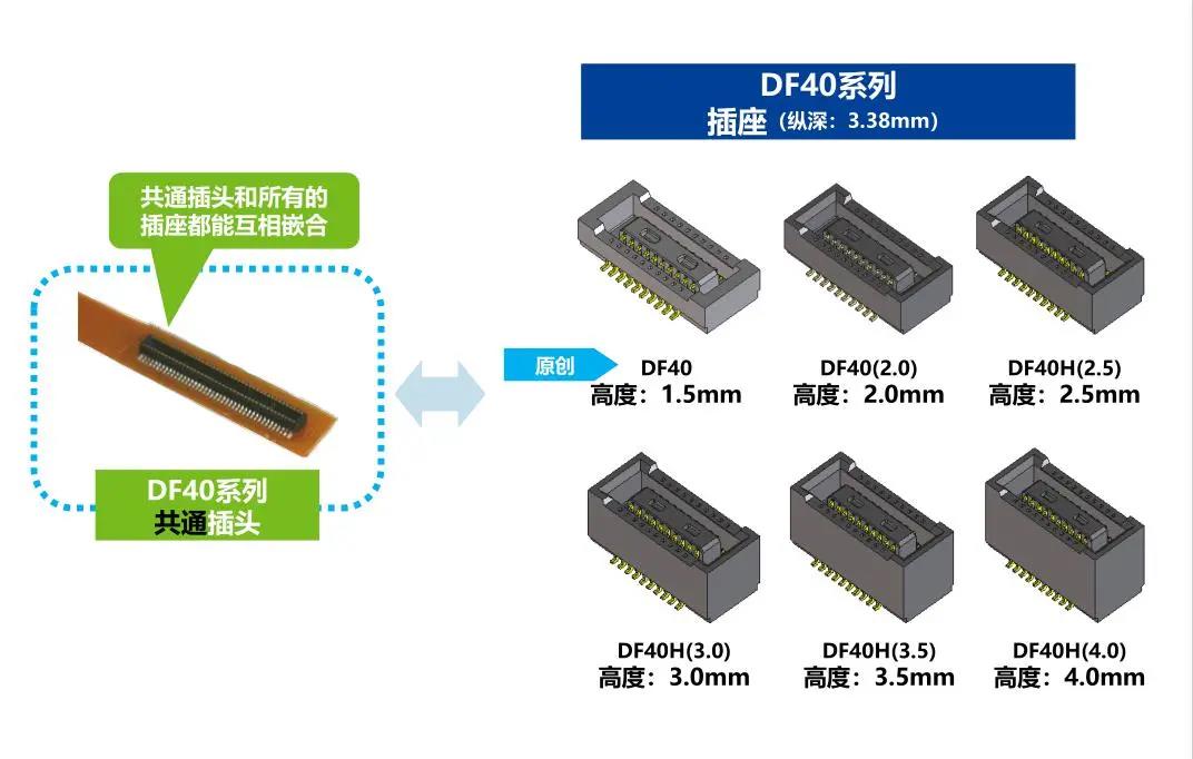 特點 1. 省空間:縱深3.38mm 2. 堆疊高度 1.5-4.0mm 3. 對應USB4 Gen.2(10Gbps)信號傳輸 *1 4. 有效嵌合長度長:0.45mm 5. 卓越的端子構造實現了明確的鎖扣手感以及大嵌合力 6. 防止端子變形構造 7. 種類繁多(帶護罩:DF40G系列,帶完全鎖:DF40GL系列,ADAS:DF40T系列) 8.核心數量從10到120核心變化巨大 9.用導向肋確保自動對準:0.33mm 10.防止鎳阻擋層焊接的結構 11.還提供用于生產線檢查的高度耐用的連接器* 只有H=1.5 mm的產品支持Type-C DF40系列變體