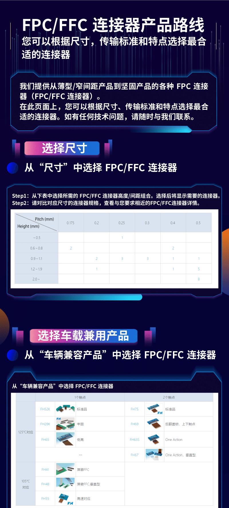 我們提供從薄型/窄間距產品到堅固產品的各種 FPC 連接器(FPC/FFC連接器)。